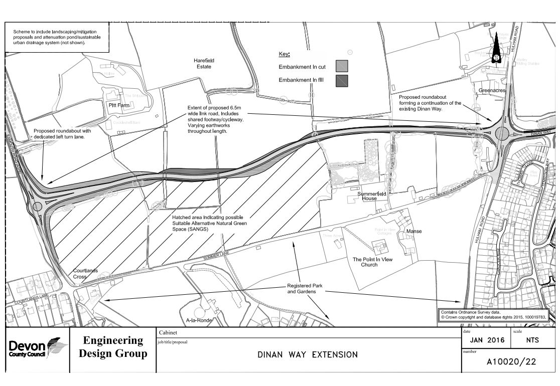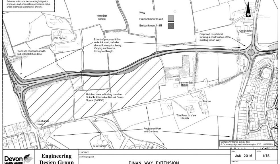 “Dinan Way has comparatively low traffic flows compared to the A376 and B3179, which indicates that it has significant additional capacity and the completion of Dinan way will provide a high quality continuous link to the large residential and employment areas on the northern edge of Exmouth.”