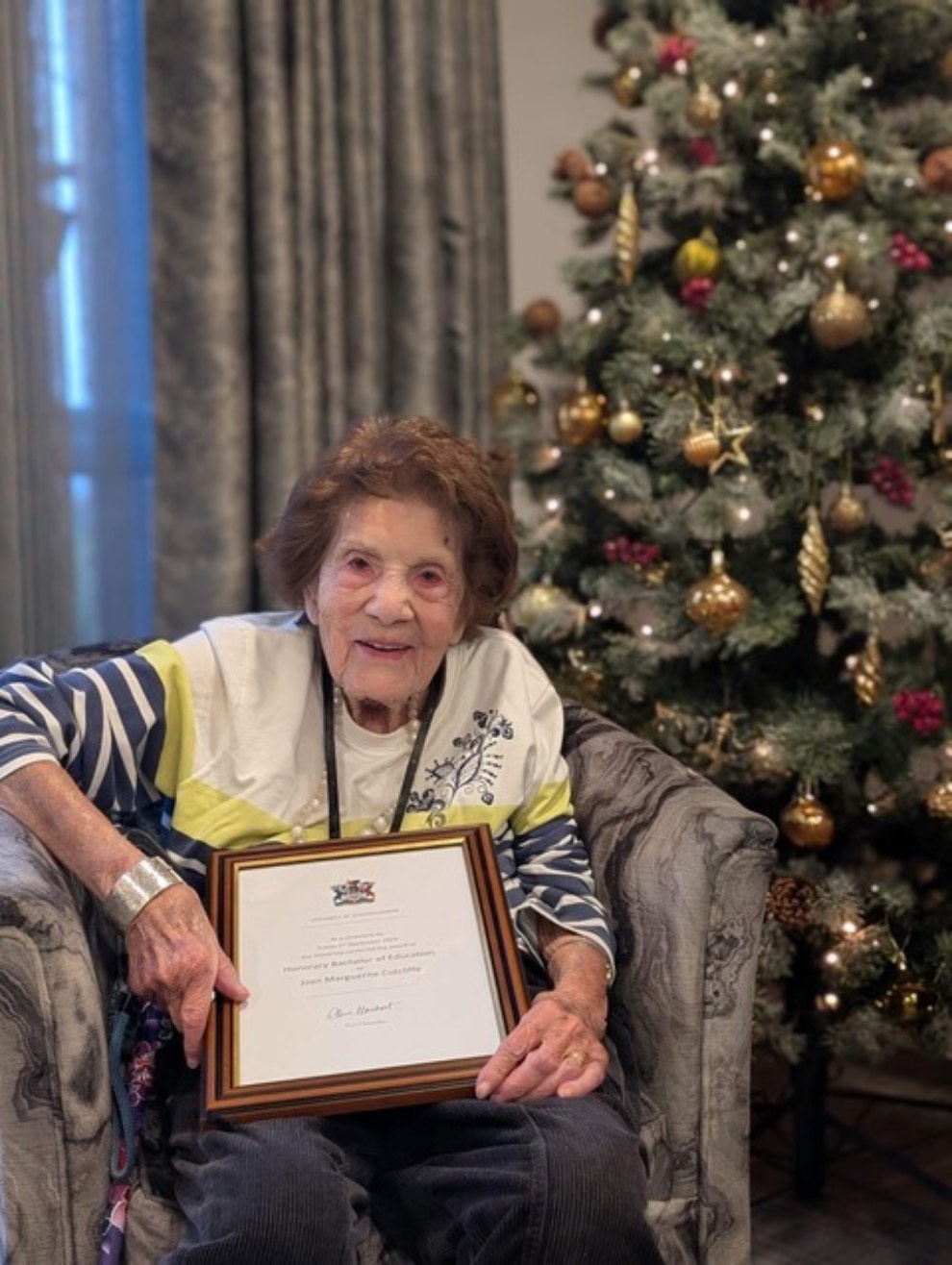Staff and residents at Barchester’s Cumberland Grange Care Home in Exeter are over the moon because one of their much-loved residents, Joan Mundy, has been awarded an Honorary Bachelor of Education certificate by the university of Gloucestershire aged 106. Joan was so thrilled to receive her certificate finally after 86 years since leaving St Mary’s College Cheltenham.