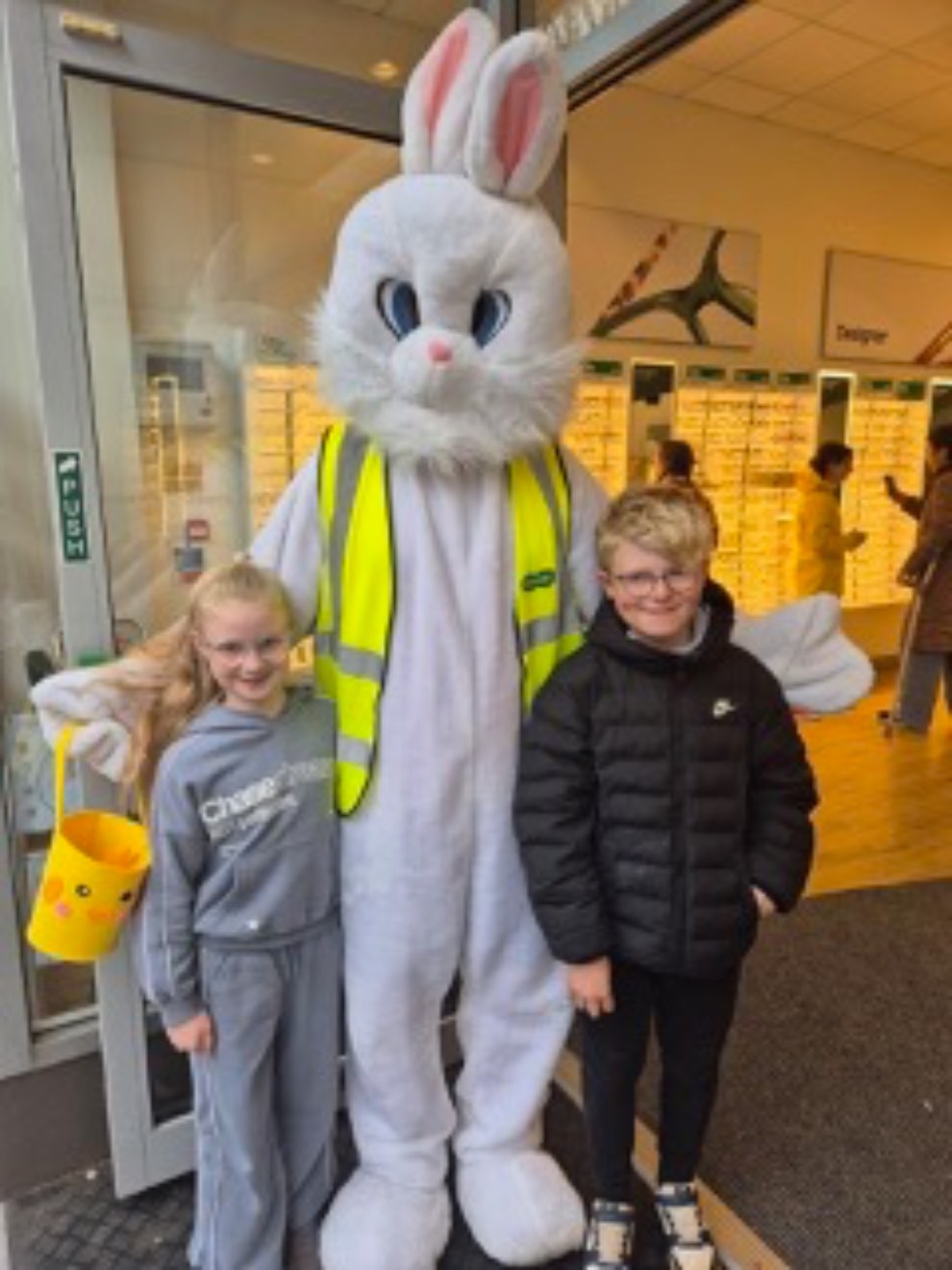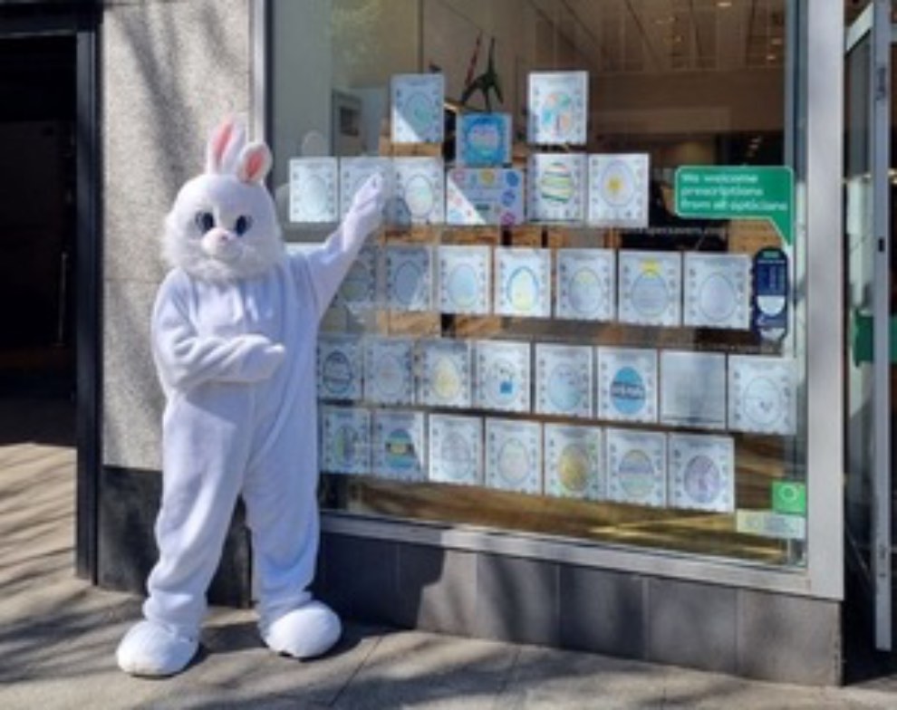 The city’s Specsavers store was playing host to a giant Easter Bunny who was handing out chocolates and receiving drawings from youngsters for a Design an Egg competition.