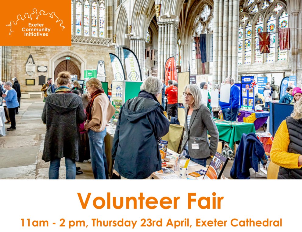 Exeter Community Initiatives is delighted to announce the return of the Exeter Volunteer Fair, taking place on Thursday 23 April 2026, 11am–2pm at Exeter Cathedral.