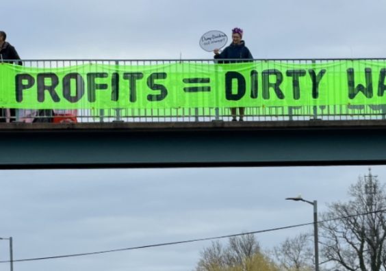 They protested outside South West Water's headquarters, Peninsula House in Exeter and also tied banners on to a pedestrian bridge over Old Rydon Lane.