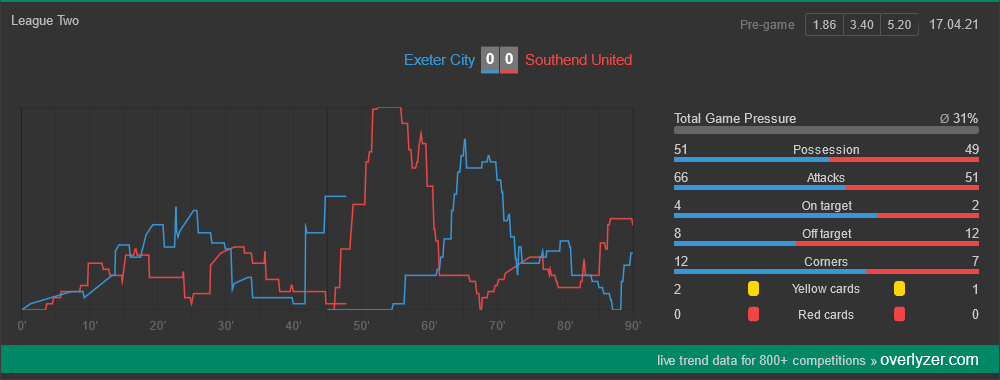 After a disappointing 2-1 away loss to lowly Barrow City, there were hopes the Grecians would bounce back to winning ways against another struggling side in Southend United. However, another characteristic lack of efficiency in the final third while playing at home seemed to be the order of the day. Overlyzer's live trends and statistics clearly show that the game was more or less evenly balanced and it’s safe to say a draw was a fair result. Asides the little period of dominance from Southend between the 50th minute and the hour-mark as well as the same for Exeter between the 60thminute and the 75th minute, both sides managed to keep each other at bay. Exeter might have made more attacking sequences but could only boast of mere two-extra efforts on goal than their opponents. They need to make their few chances count.