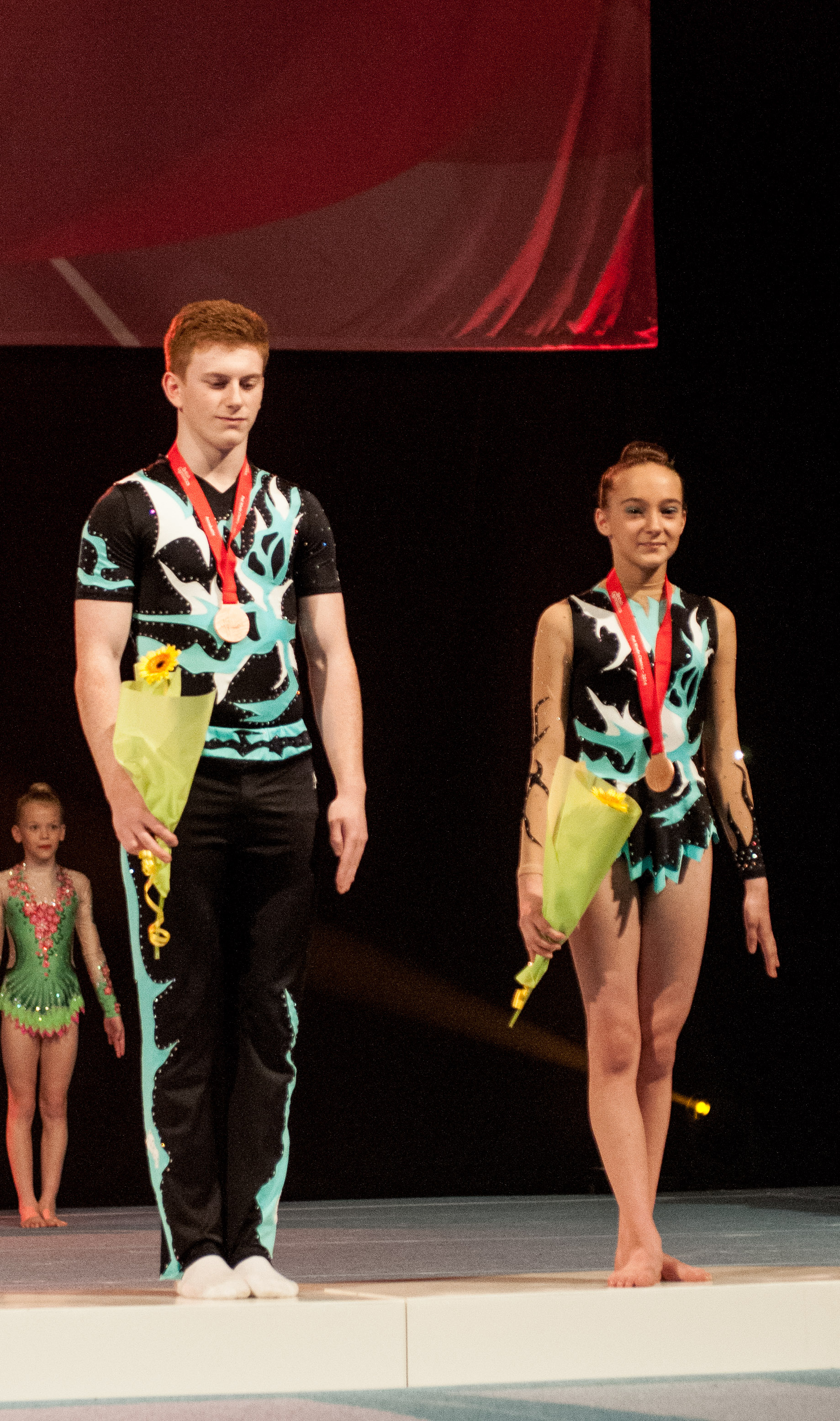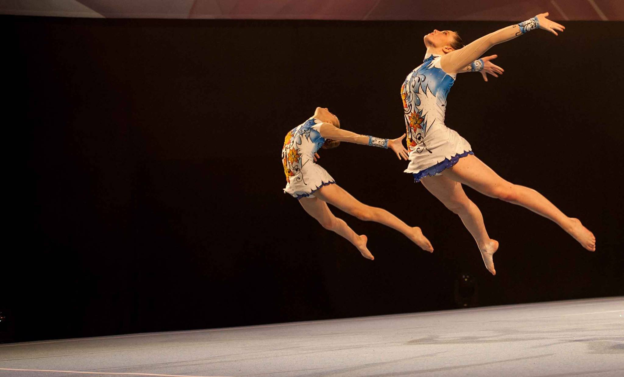 All of the partnerships competed in the 12-18 international age group category. The acrobatic tops are launched in the air by their partners for double and twisting somersaults, while the tops also balanced in handstands above their base’s heads.