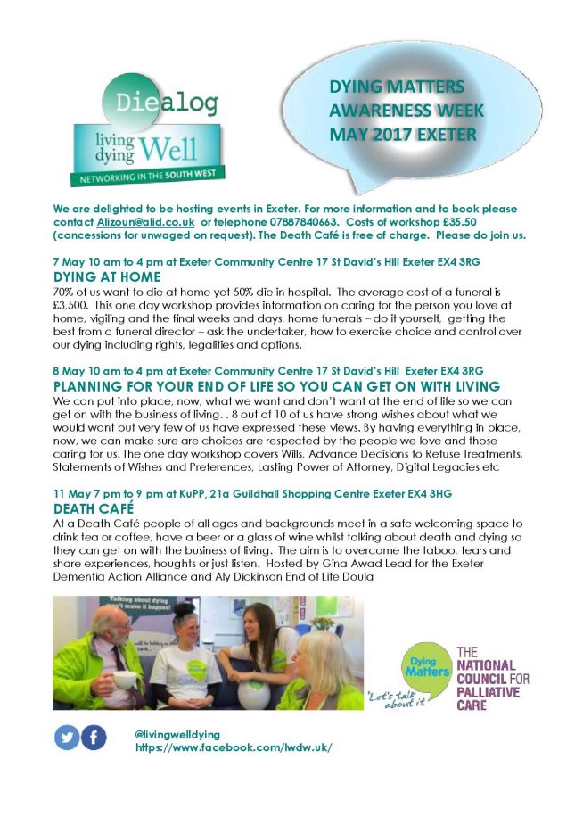 7 May 10 am to 4 pm at Exeter Community Centre 17 St David’s Hill Exeter EX4 3RG DYING AT HOME This one day workshop provides information on caring for the person you love at home, vigiling and the final weeks and days, home funerals – do it yourself, getting the best from a funeral director – ask the undertaker, how to exercise choice and control over our dying including rights, legalities and options.