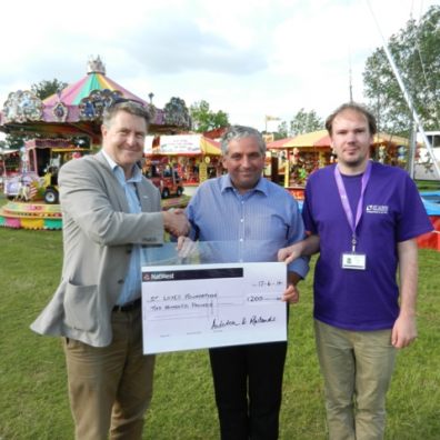 The gift was presented by cheque by Rowland Devey of Anderton and Rowlands to St Loye’s Foundation at the recent Anderton & Rowlands European Theme Park, held at Exwick Playing Fields, Exeter.
