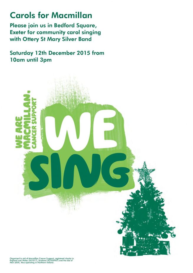 Carols for Macmillan - Join us! We will be in Bedford Square, Exeter (opposite Lloyds Bank) on Saturday 12th December for some good old fashioned carol singing. Please come and join in! With thanks to members of Ottery St Mary Silver Band for playing for us. Full event details