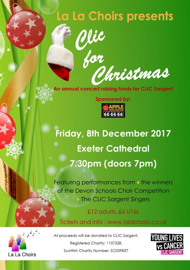 On Friday 8th December this year La La Choirs will perform the 3rd annual ‘CLIC for Christmas’ concert at Exeter Cathedral in aid of CLIC Sargent, the UK’s leading cancer charity for children and young people. In 2015 we raised £9,600, in 2016 we raised £12,000 and for 2017 we are aiming even higher! We are thrilled to welcome headline sponsors Apple Taxis on board this year, and with their support we know we can help more families through the most traumatic time of their lives.
