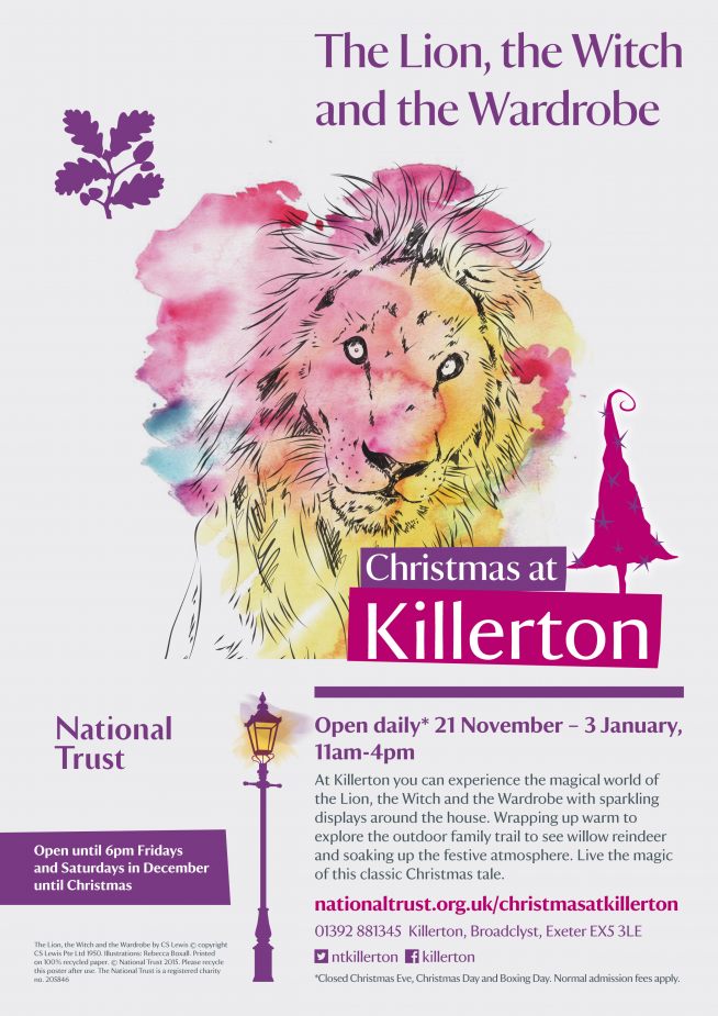 The magical world of Lion, the Witch and the Wardrobe is brought to life at Killerton. You can see the house transformed into scenes from the classic fairy-tale. Wrapping up warm to follow the outdoor family trail, take part in activities and see if you can spot the willow reindeer under thousands of twinkling lights.The estate stays open until 6pm on Fridays and Saturdays in December so you can fall in love with Killerton at dusk. The shop will be selling beautiful gifts, Christmas trees and local produce and the cafe and restaurant will serve up delicious treats. Bring the whole family...