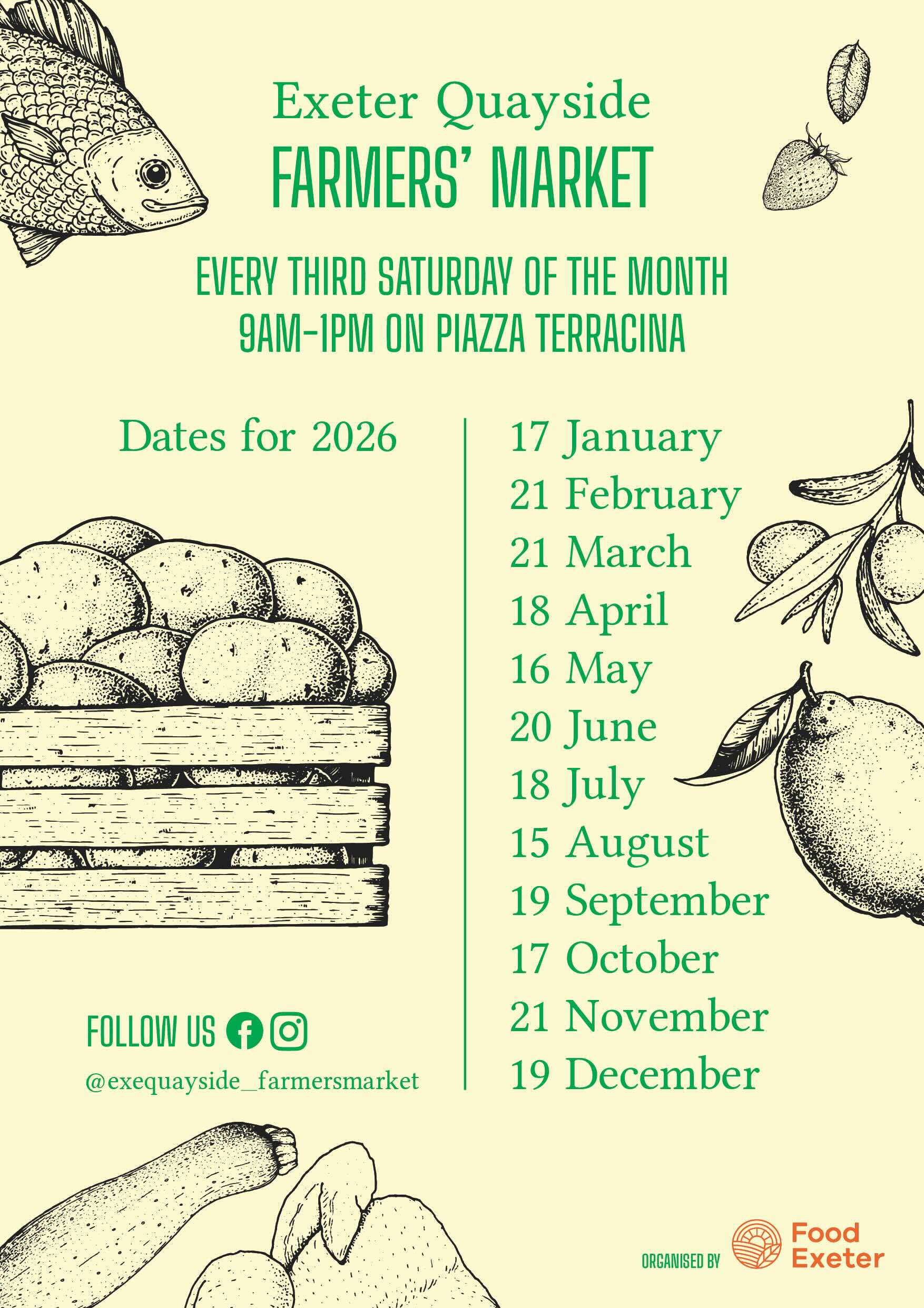 Come and visit the new Exeter Quayside Farmers’ Market from 9am to 1pm, every 3rd Saturday of the month down at the Piazza Terracina!